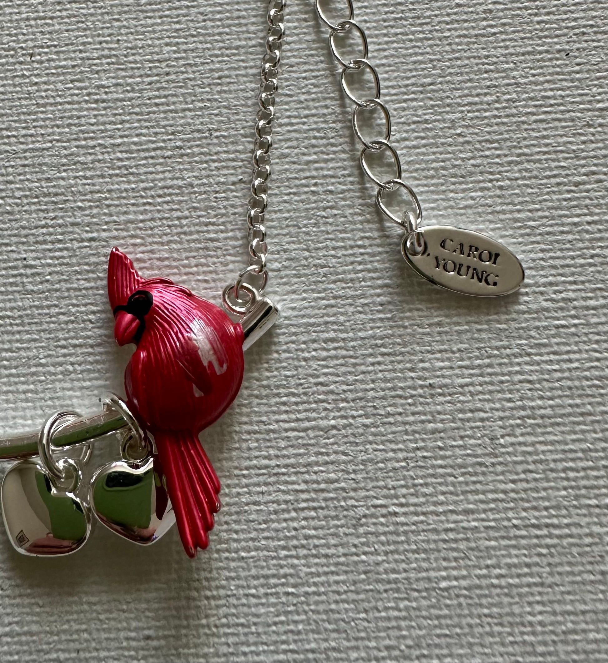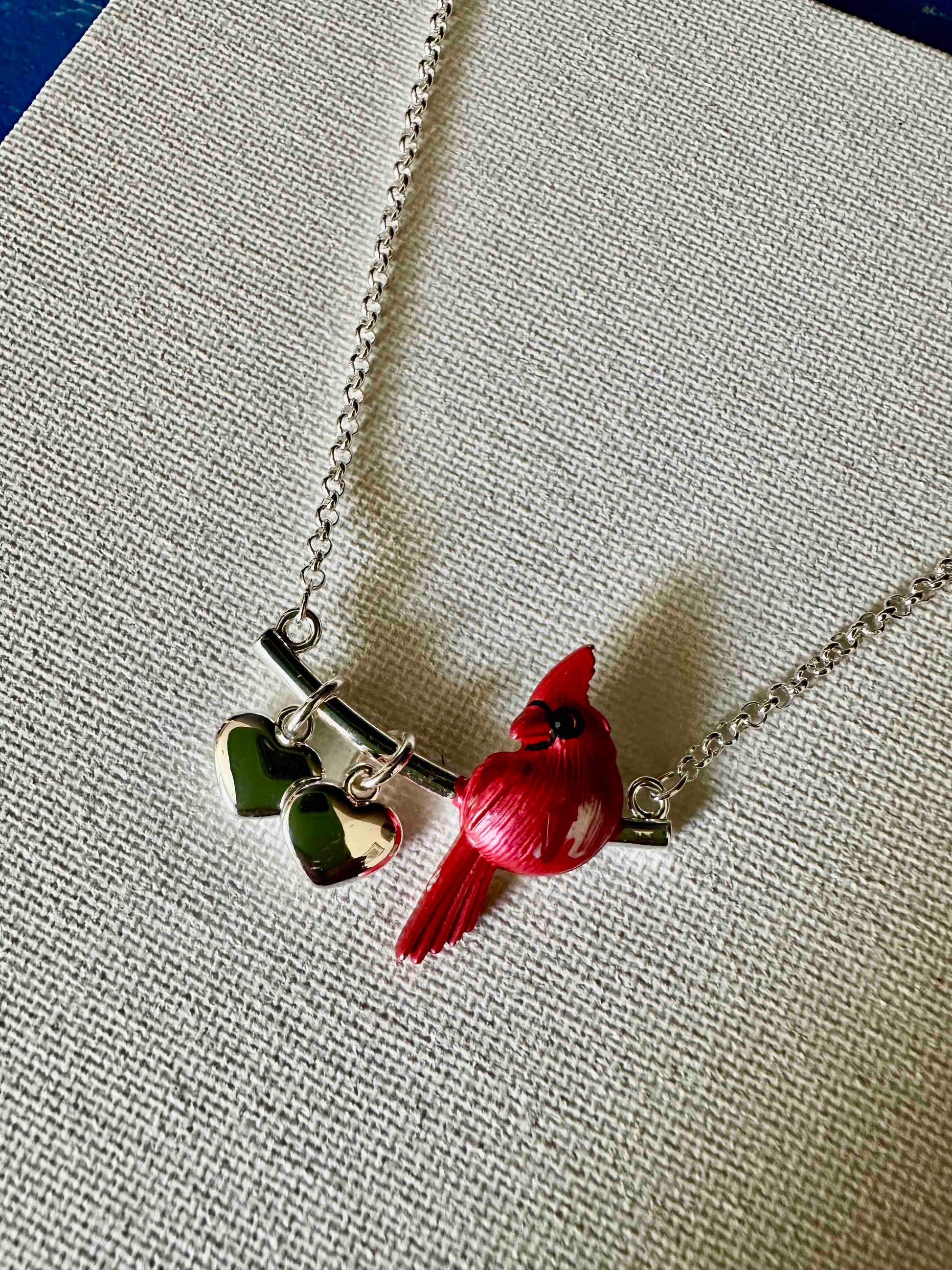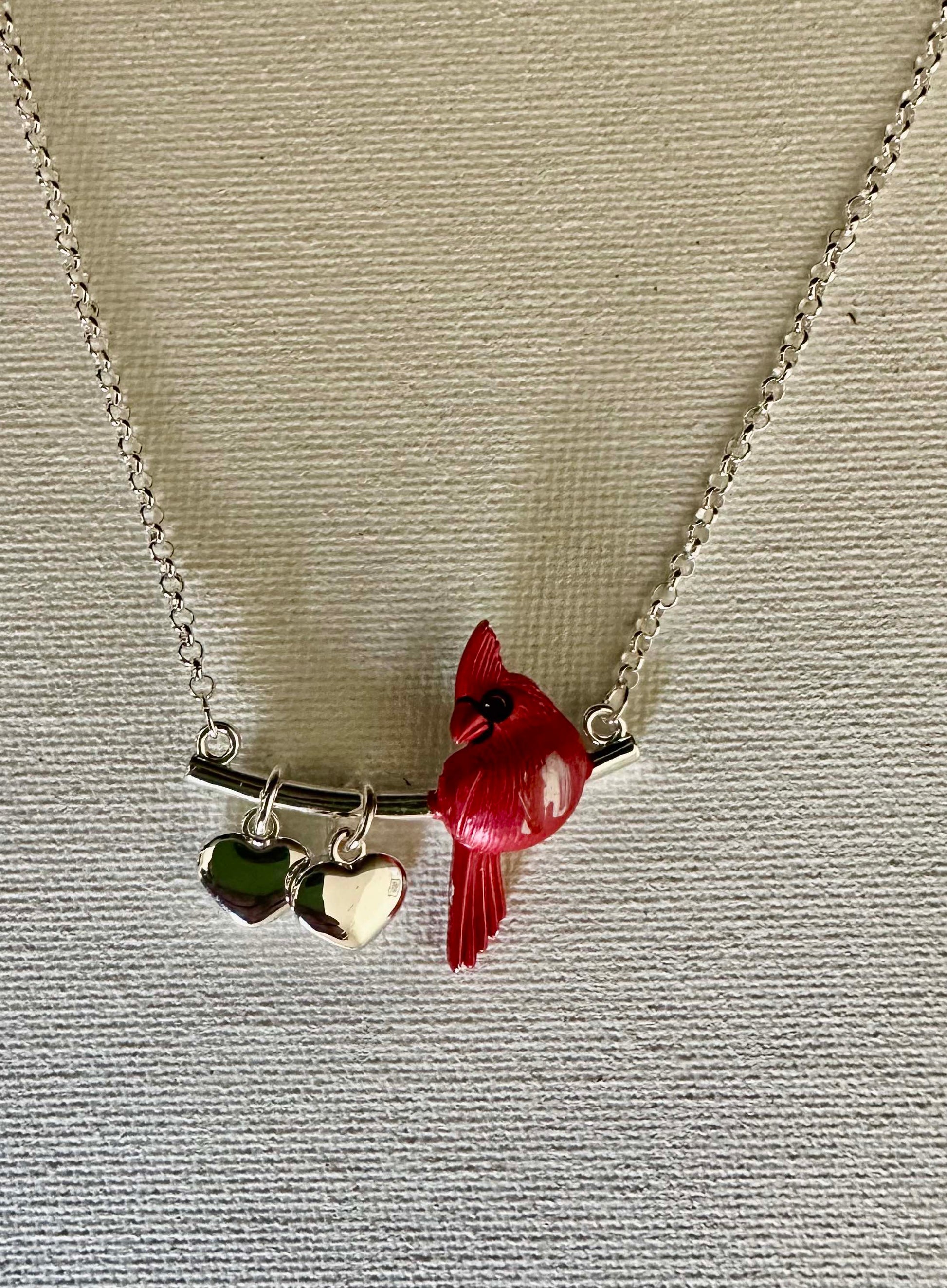 A bright and cheerful cardinal, beautifully colored and textured with enamel, sits on a silver tone, curved bar with 2 sweet puffy hearts hanging from it.