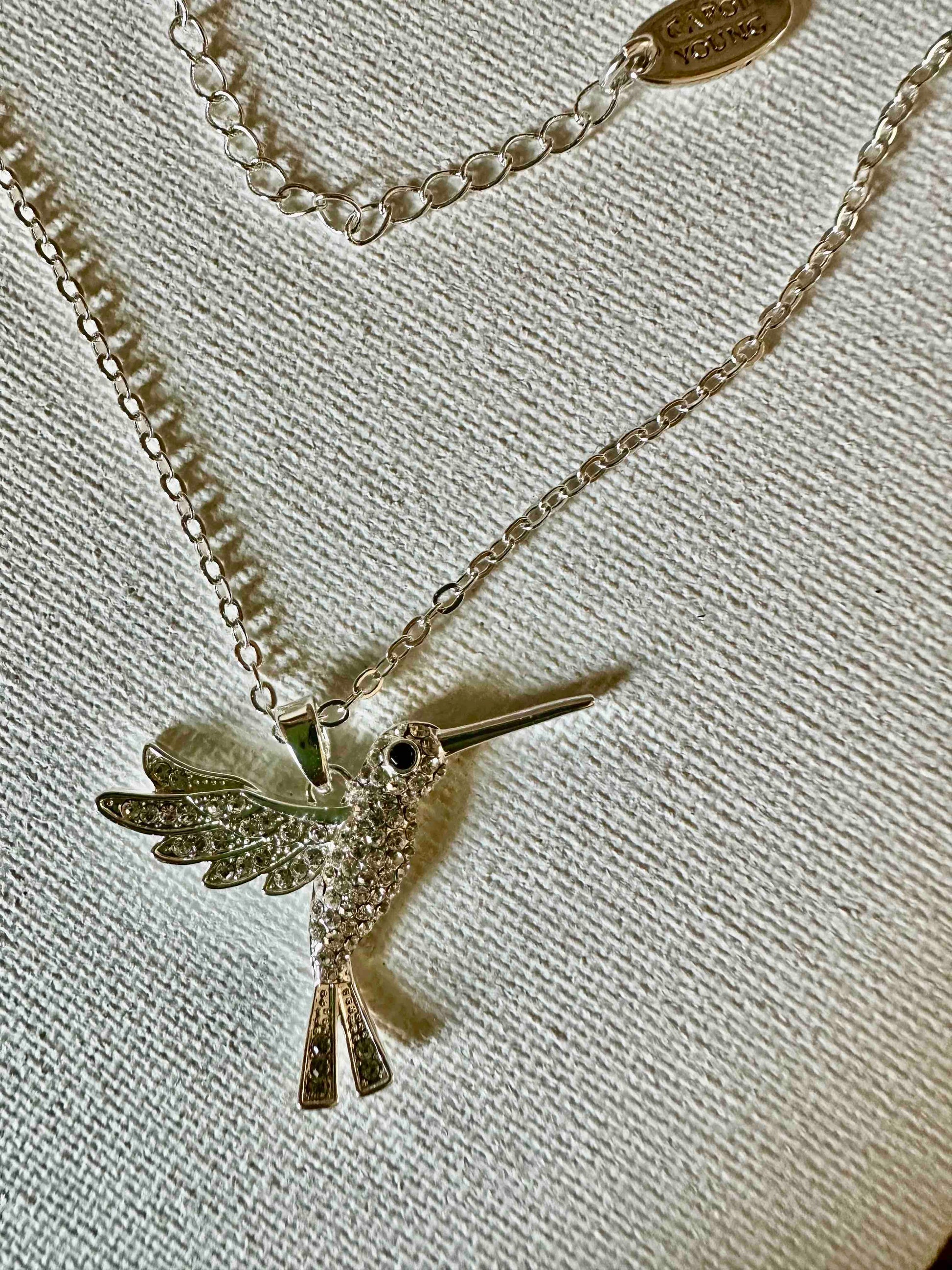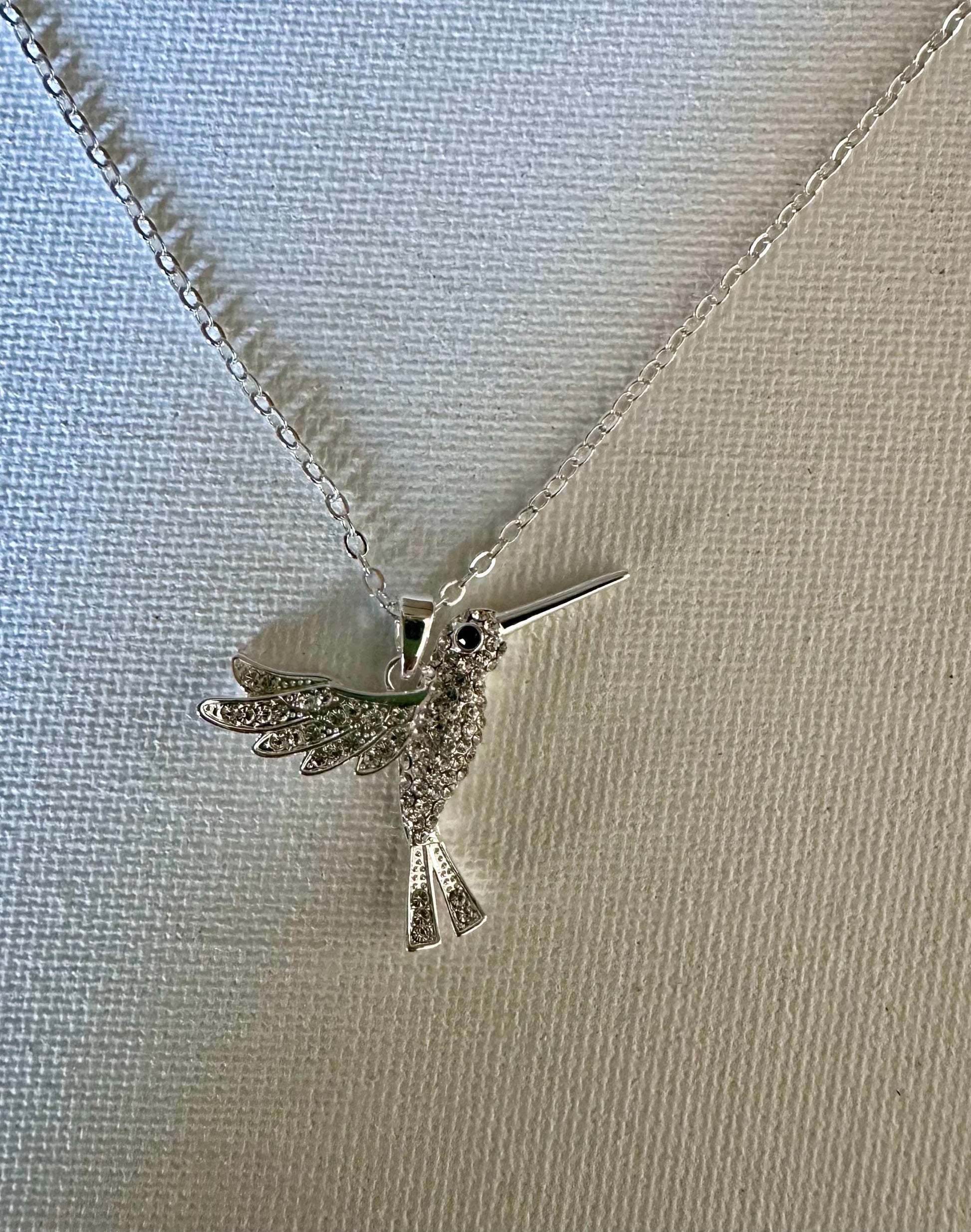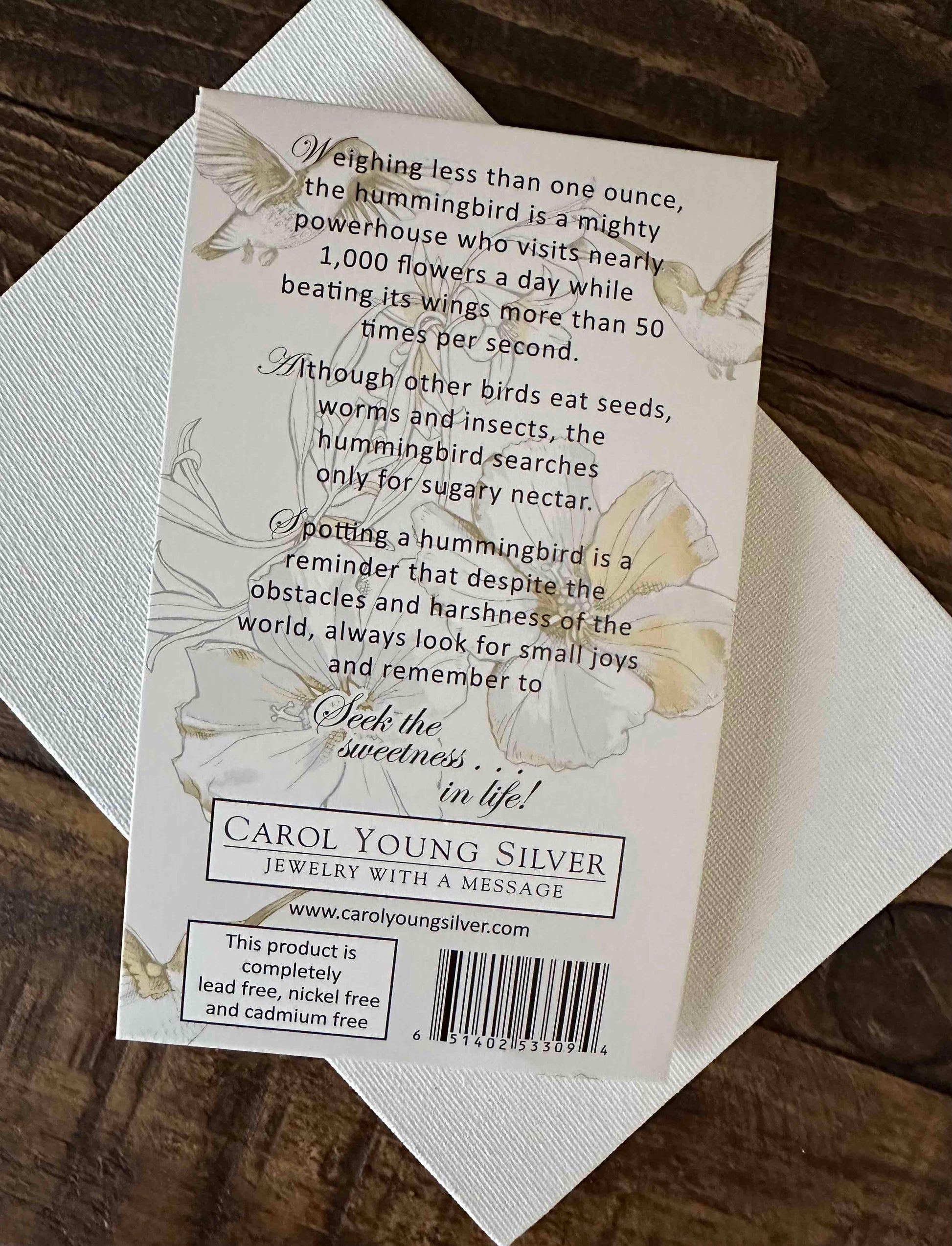 A petite hummingbird necklace packaged on a card with the tagline, “Seek the sweetness in life ”. The full message is printed on the pack of the card.