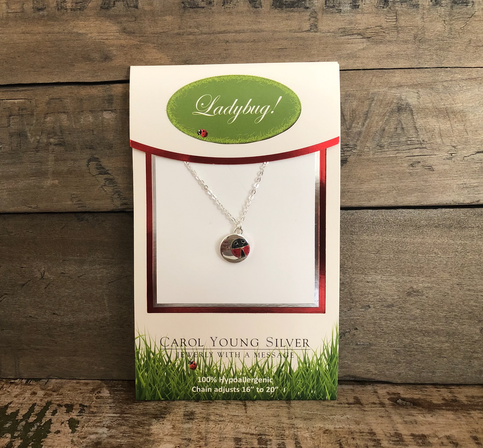An adorable red enamel ladybug sits on a bright and shiny silver tone disk. Her eyes are made of white CZ’s
