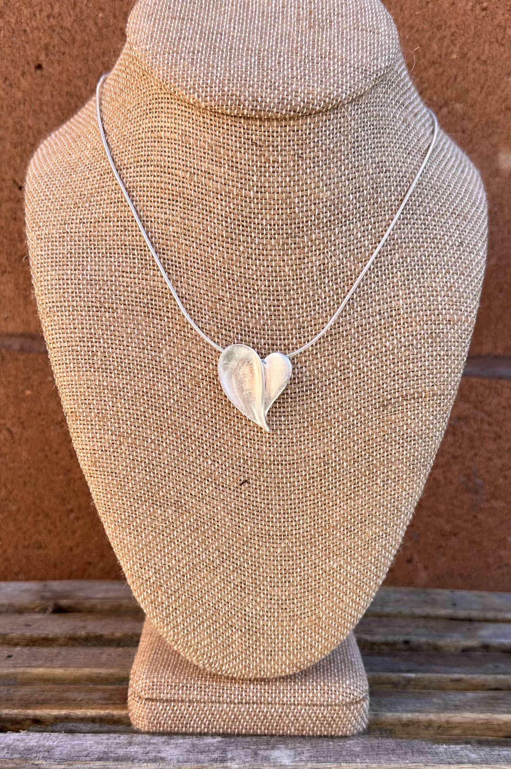 This swirled, puffy heart features a silver tone, matte finish. There are rough lines and marks to make it a very etched.