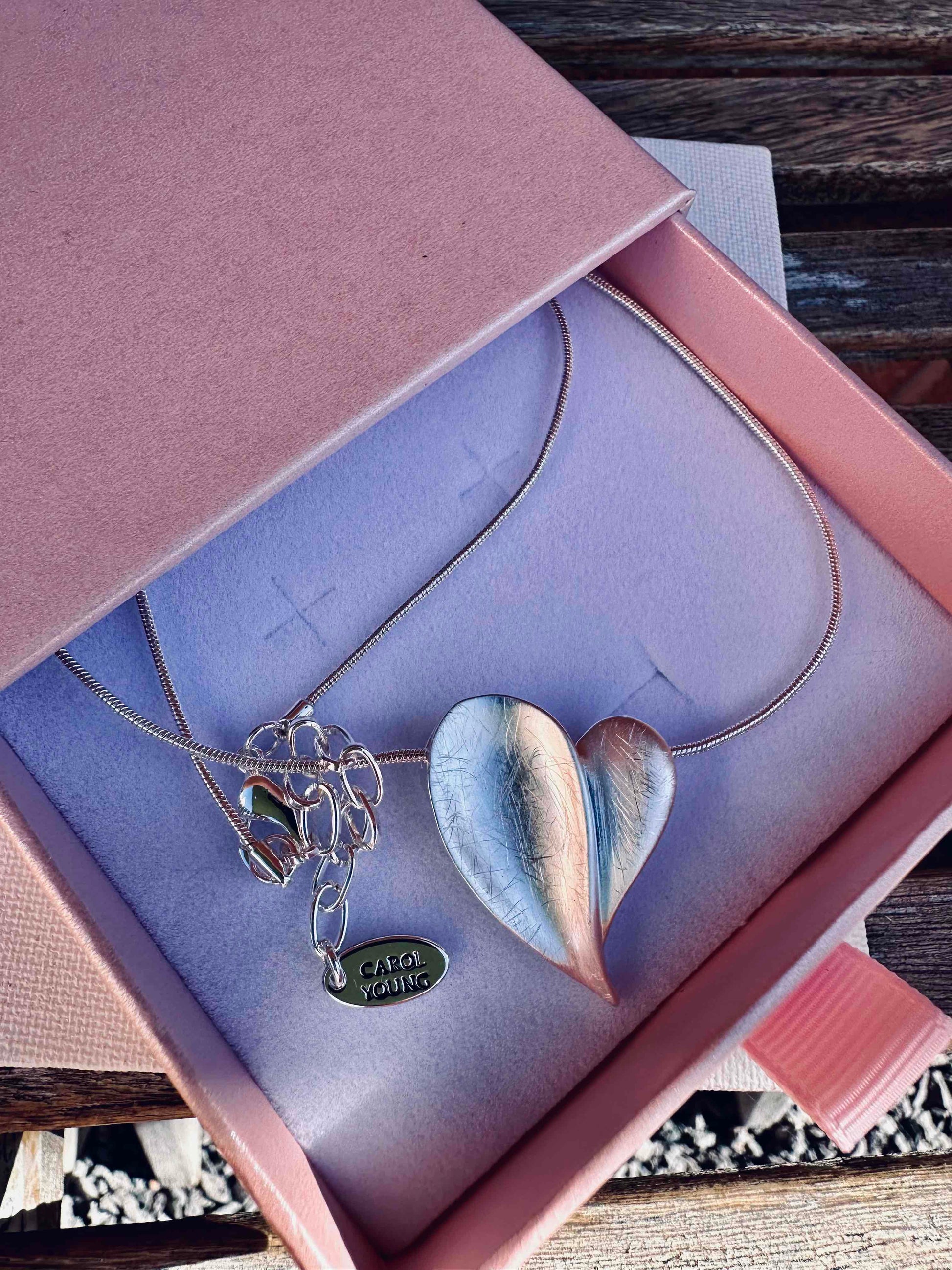 The puffy heart is hanging from a silver tone cord chain that is adjustable in length from 16" to 20". There is a logo tag at the end of the chain, adding value to this beautiful piece.