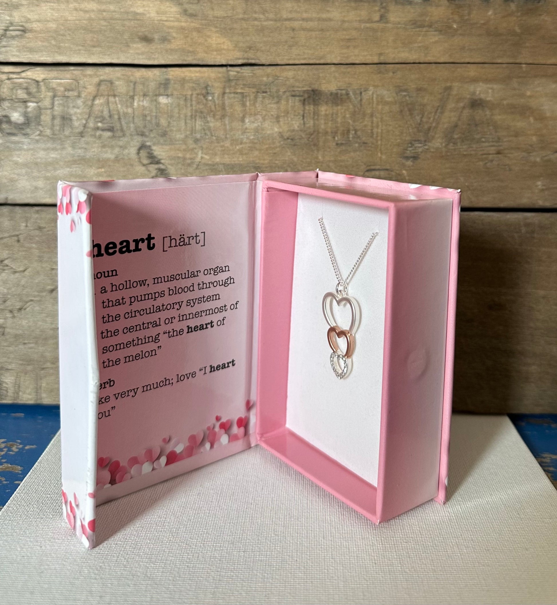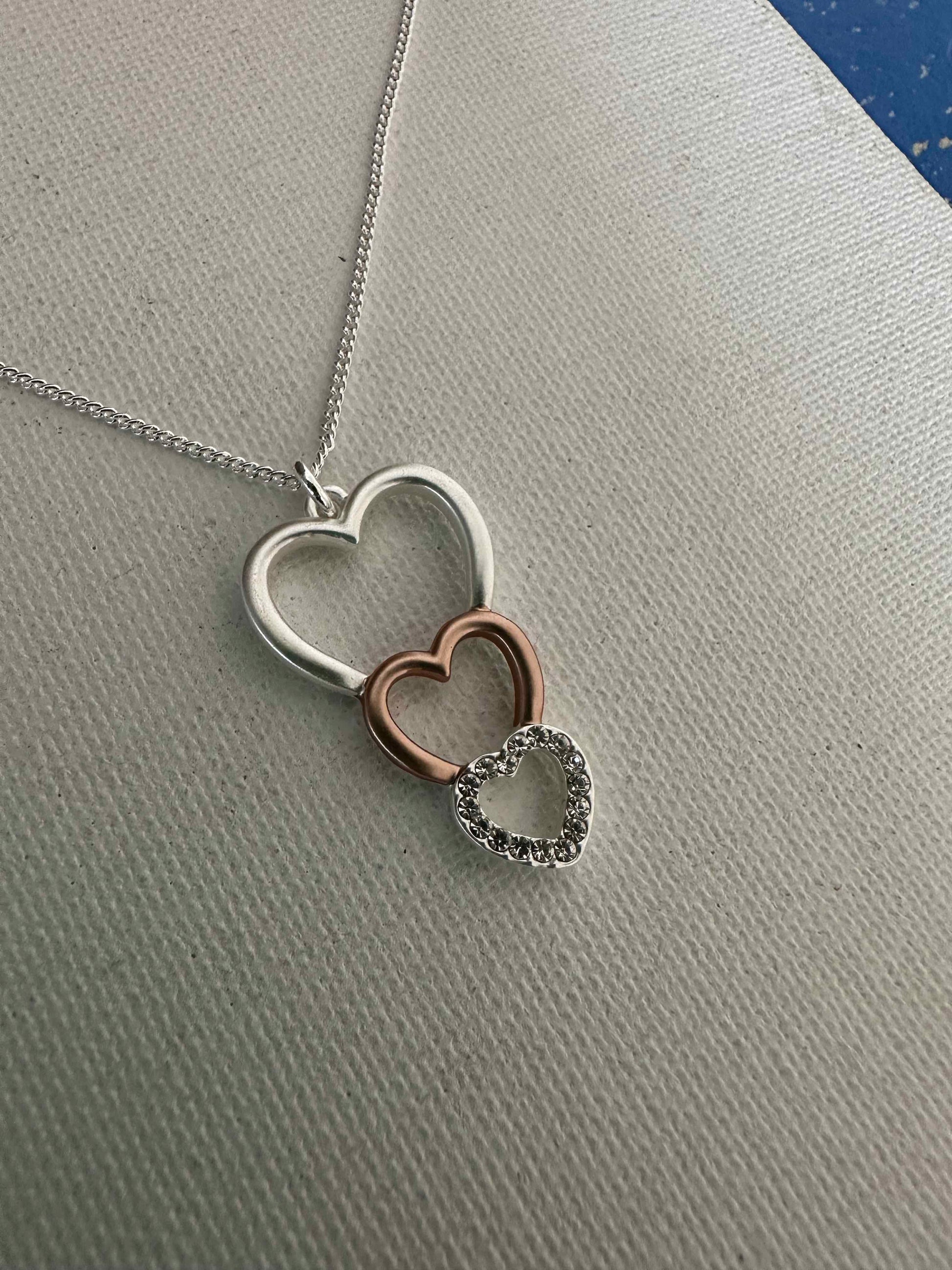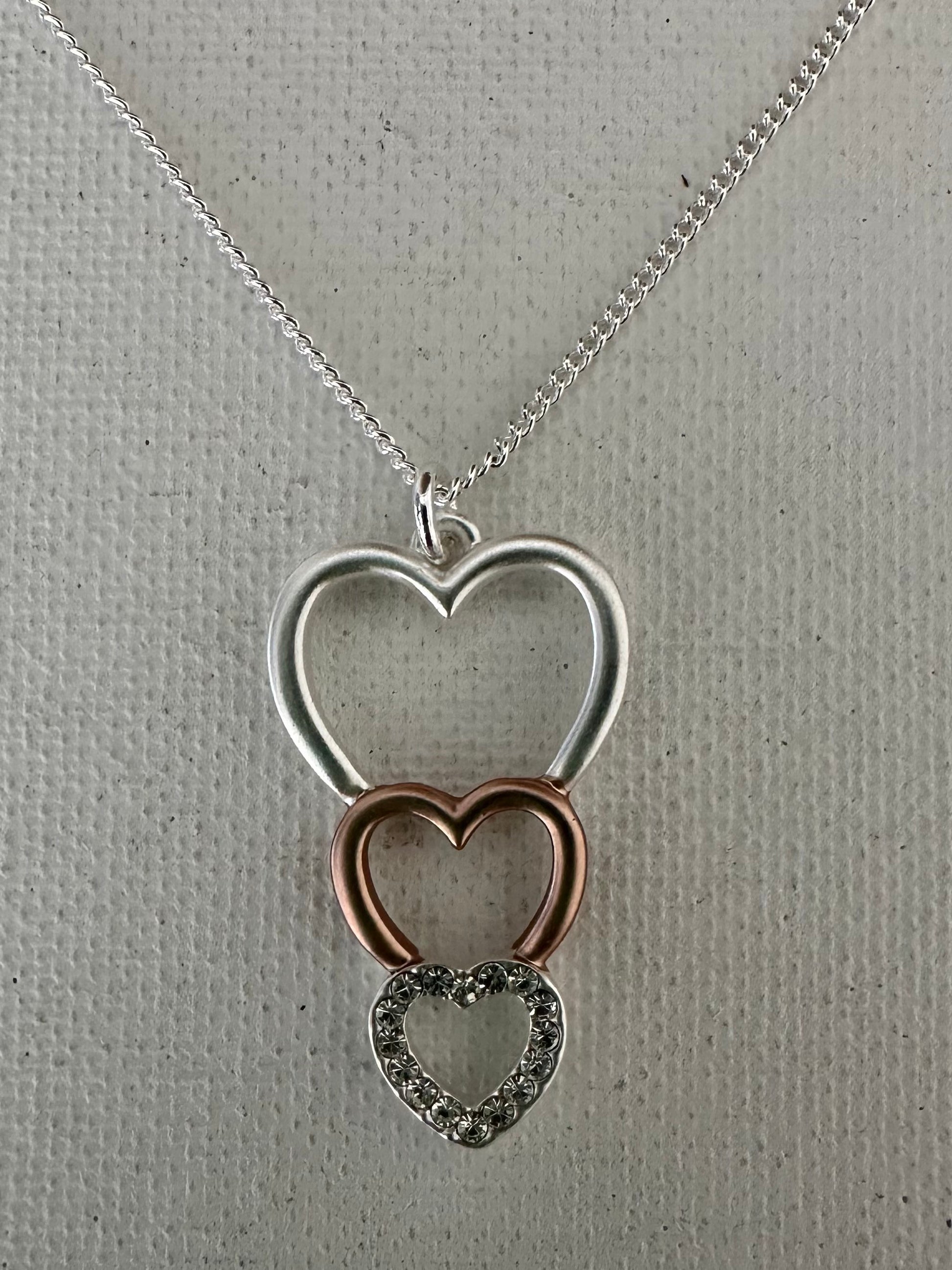 These three hearts offer a spectacular mix of brushed silver tone, brushed rose gold and sparkly cubic zirconias. This trio is suspended from a delicate link chain that adjusts in length from 16" to 20"